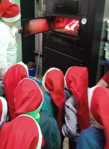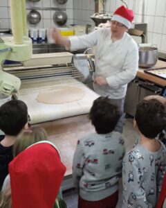 Für die Schlaufüchse, die Vorschulkinder der Kita Zwergenvilla, gab es ein besonderes Highlight in der Adventszeit. Unser täglicher Brot- und Brötchenlieferant und Lieblingsbäckerei Mertes in Lieser hat uns zum Plätzchen backen eingeladen. Zuerst bekam jedes Kind eine Nikolausmütze und Bäcker Mertes erklärte uns die großen Maschinen und Öfen. Ein leckeres „Bäckerfrühstück“ mit ofenfrischem Baguette, warmem Kakao und anderen Leckereien war der beste Start in einen schönen Vormittag. Mit einer Riesenrollmaschine durften die Kinder den Teig ausrollen, auf die Arbeitsplatte legen und mit Förmchen ausstechen. Ein anderer Teig wurde mit Spritztüten auf das Blech gespritzt. Mit Begeisterung waren die Kinder dabei, stellten Fragen und wuselten emsig herum. Nach dem Backen haben die Kinder die Plätzchen in Schokolade getaucht und dann in Tüten verpackt. Mit viel reicher „Beute“ kehrten wir in die Kita zurück und konnten von einem erlebnisreichen Vormittag erzählen.